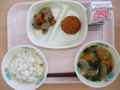 主菜のハンバーグにはトマトソースをかけました。トマトの赤い色には、「リコピン」という成分でがんや動脈硬化を予防したり、肌にできるシミやくすみをおさえるはたらきがあります。リコピンは、生で食べるより加熱した方が吸収されやすくなります。また、トマトには疲労回復効果もあります。